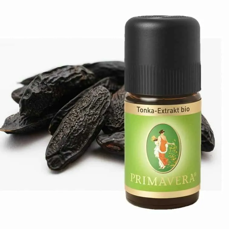 The common tonka tree ( Dipteryx odorata) belongs to the butterfly family. The Tonka is about 20-25m high. The wood is called Cumarรบ or Brazilian teak and is very sought after. Its occurrences are in South America, Asia and West Africa. Tonka Extract organic essential oil from Primavera comes from Brazil. Tonka extract is obtained from the fruits and beans. Traditionally, tonka beans are fermented in rum and then air-dried. Tonka beans are used as a spice, for desserts, in Christmas bakery (stollen) and as a smoking substance.